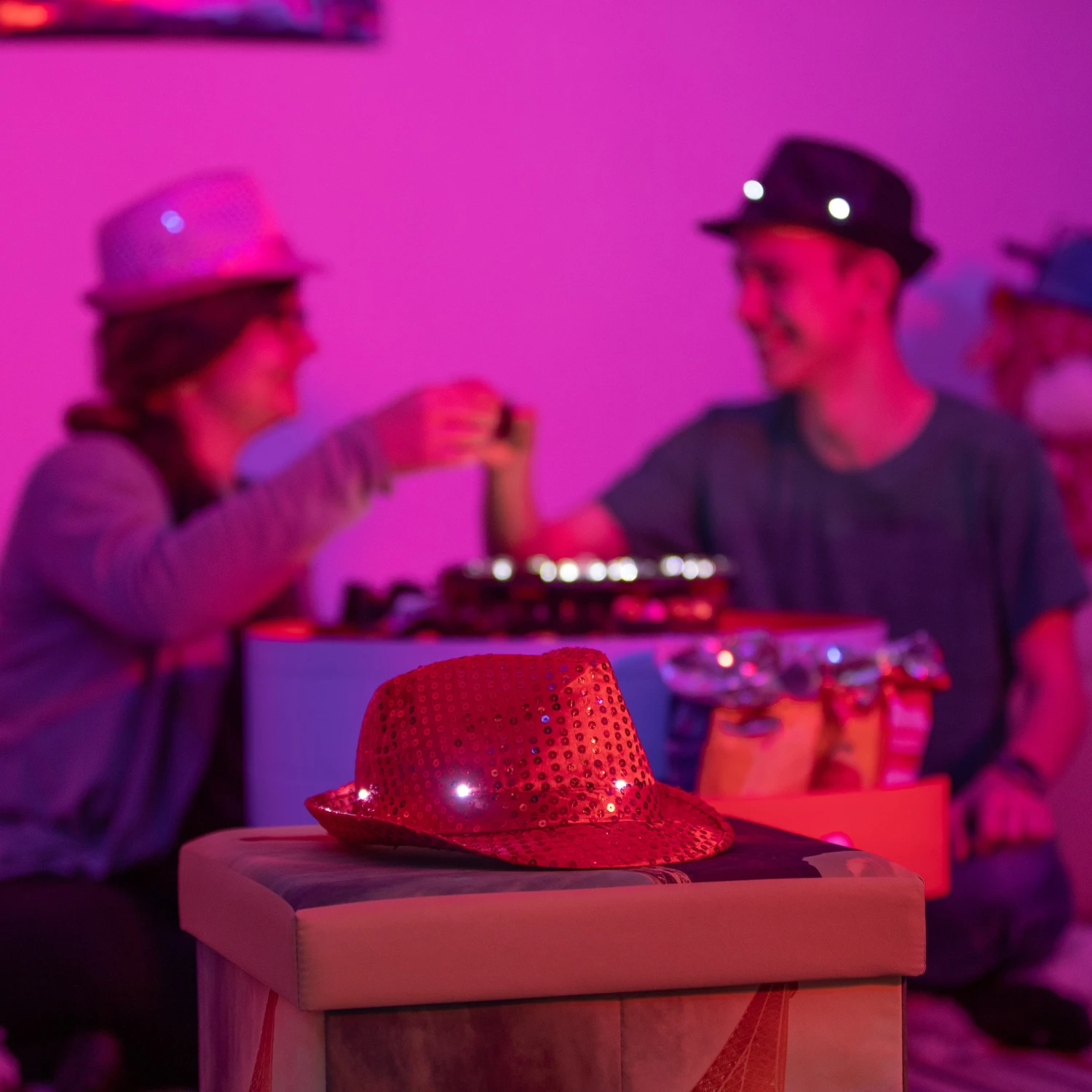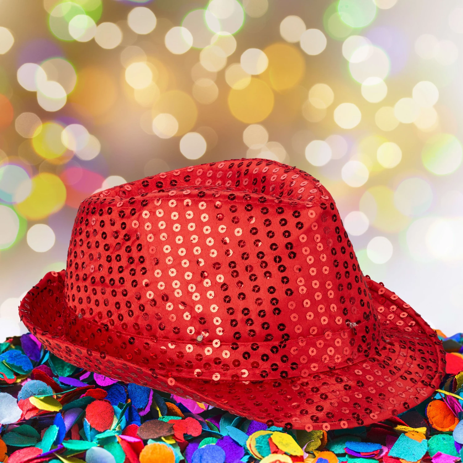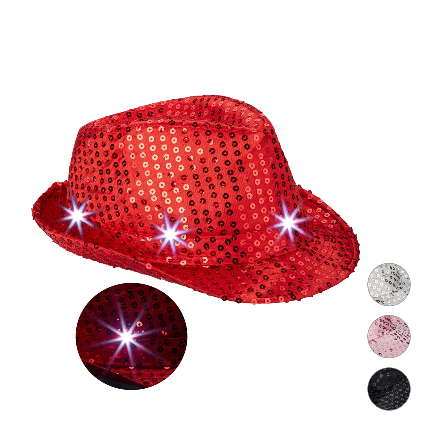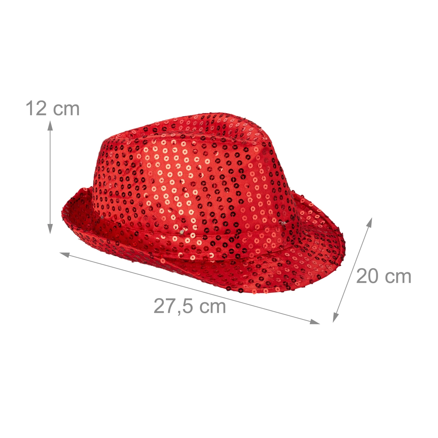 Mit diesem funkelnden Bogart Hut ziehen Sie alle Aufmerksamkeit auf sich! Nicht nur das der Glitzer Hut durch hunderte von kleinen Pailletten extrem funkelt und strahlt, der Discohut verfügt auch noch über eingebaute LEDs, die in 3 verschiedenen Geschwindigkeitsintervallen blinken können. Statten Sie sich und Ihre Freunde mit den Partyhüten aus, um die perfekte Aufmachung für den Junggesellenabschied zu haben. Auch zum Fasching, zu Silvester oder auf verschiedenen Mottoparties ist der Leuchthut ein geniales Accessoire, mit dem bewundernde Blicke garantiert sind!