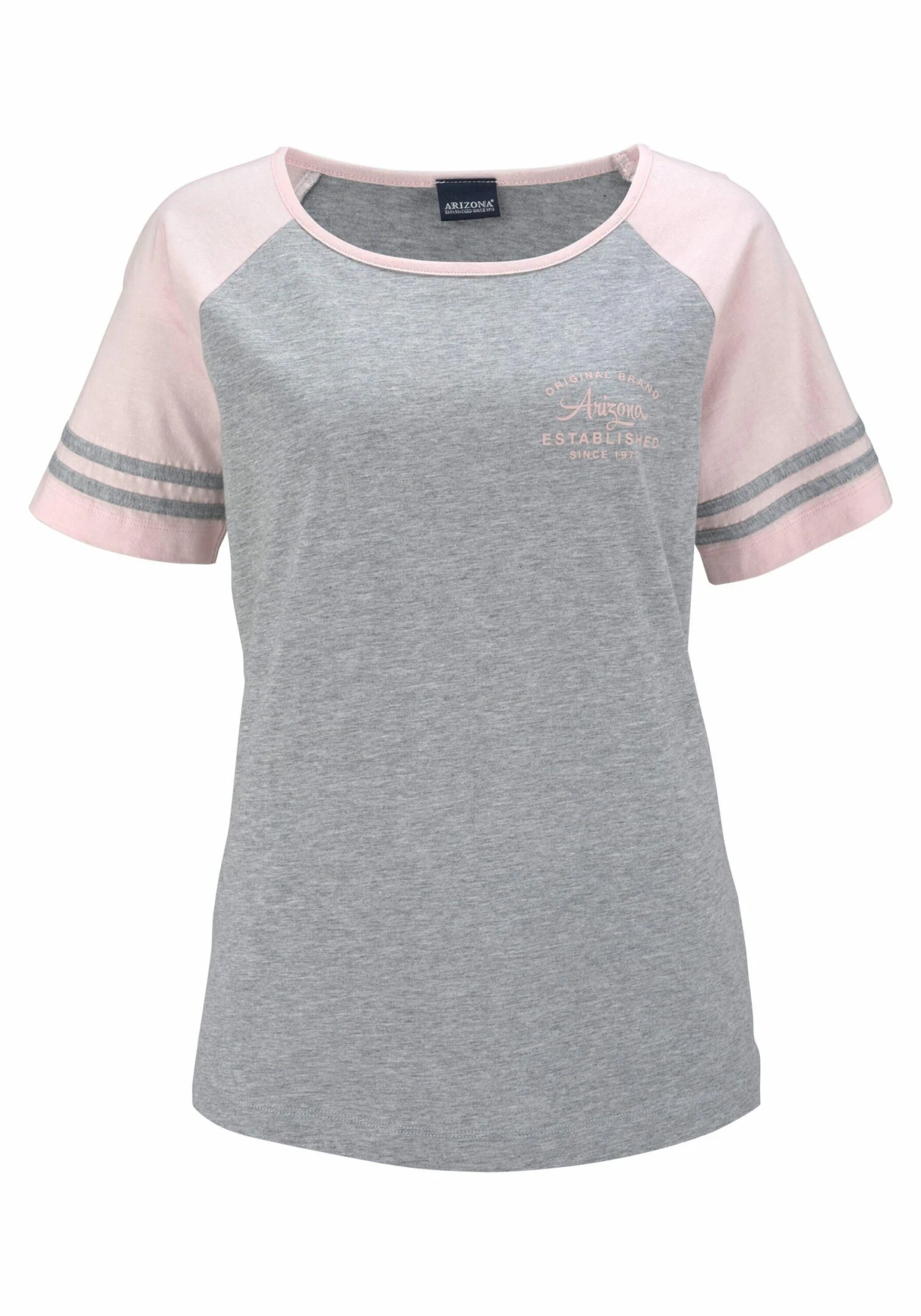 Arizona Shorty mit sportlichen Streifen an den Raglan Ärmeln. Gefertigt aus einer weichen und bequemen Single-Jersey Qualität. Aus 100% Baumwolle.