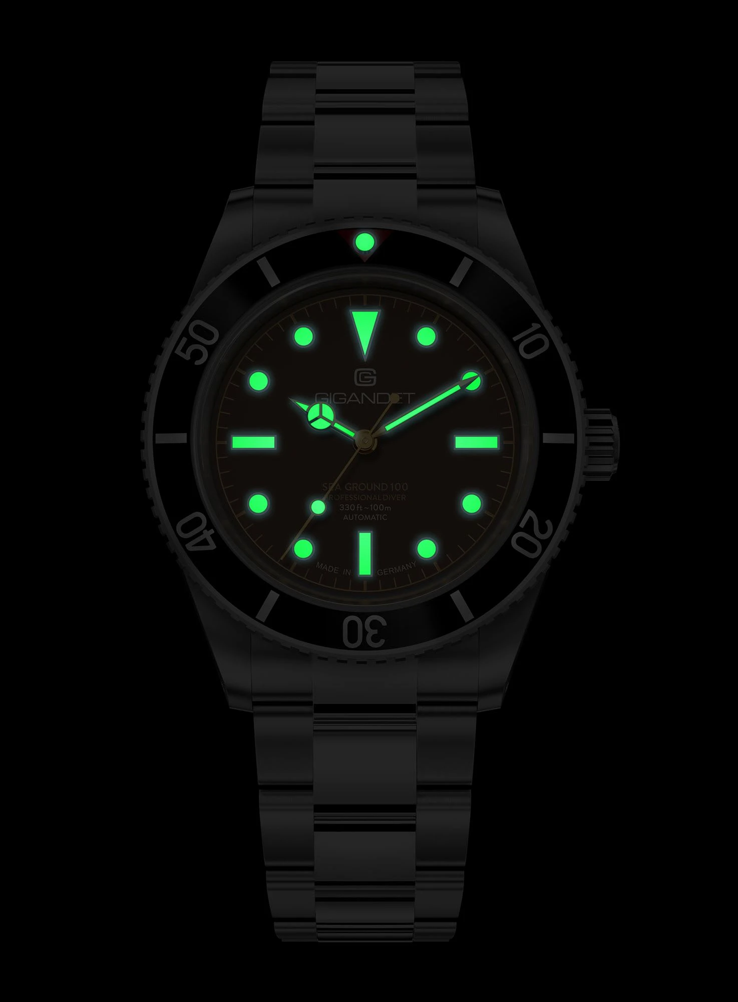 – Besonderheiten: einseitigdrehende CNC-gefräste Präzisions-Lünette 120-Klicks, veredeltem Rotor, Made in Germany, verschraubte Krone und Gehäuseboden, Super-Luminova Old Radium fluoreszierende Zeiger und Indizies, Glasboden, verschraubte Bandelemente