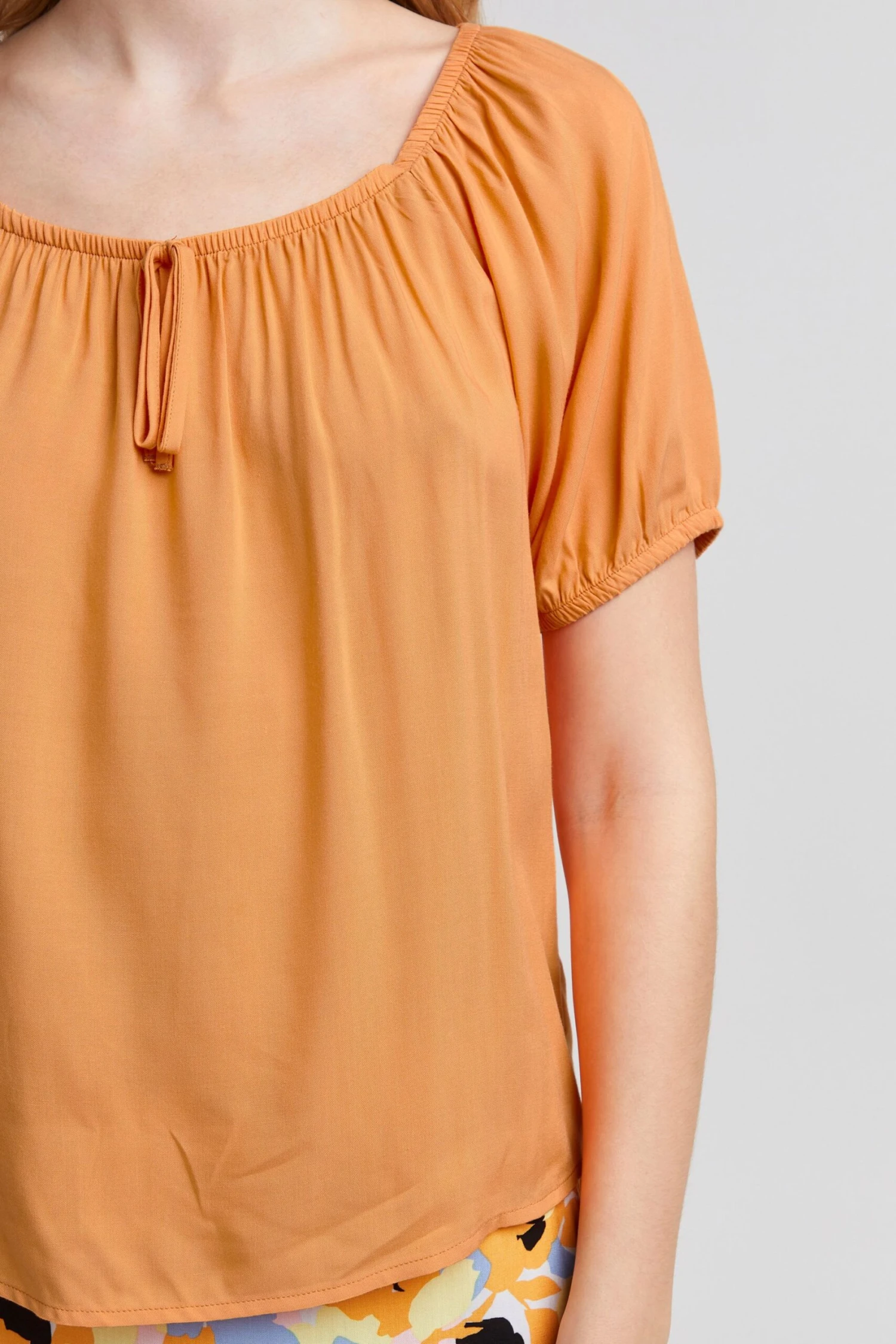 DETAILS & HIGHLIGHTS: Schicke Shirtbluse mit kurzem Arm, umspielter Ausschnitt, Regular-Fit Passform, fließender Stoff, leichtes Material, Bändchen-Details am Ausschnitt