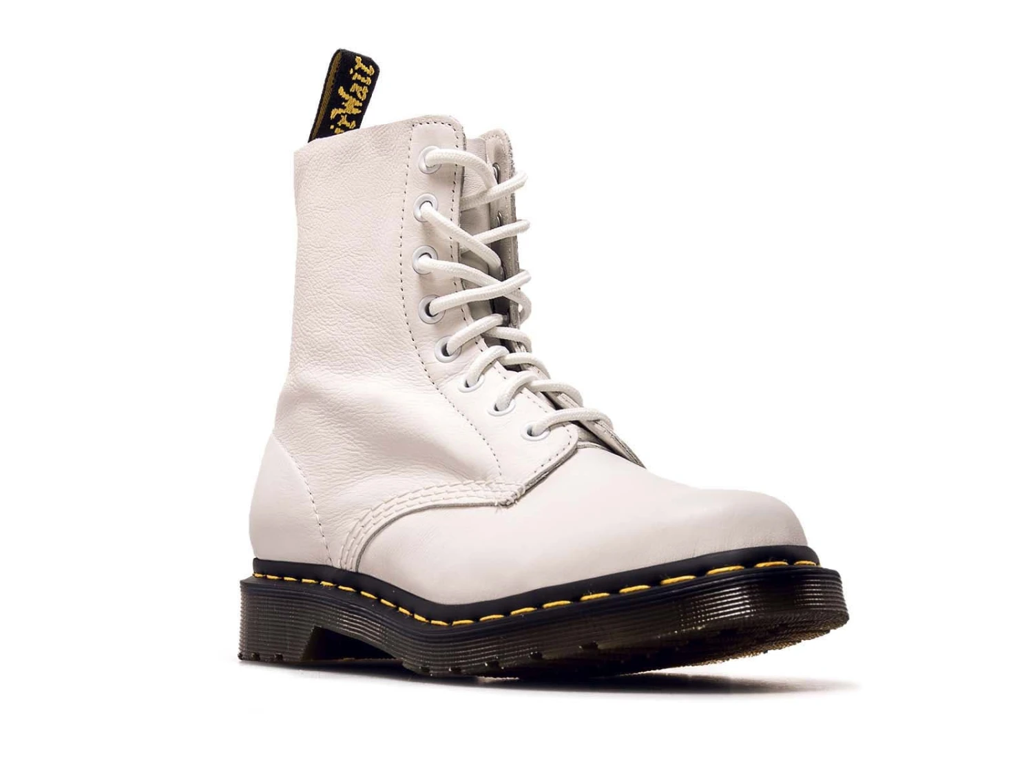 Der Dr. Martens 1460 Pascal Boot für Damen definiert Stil in einer aufgerauten und fertigen Silhouette, die den Winter im Sturm erobert! Mit einem weißen Leder, das zu einer hüpfenden PVC-Außensohle verschweißt und mit gelbem Faden genäht wurde.