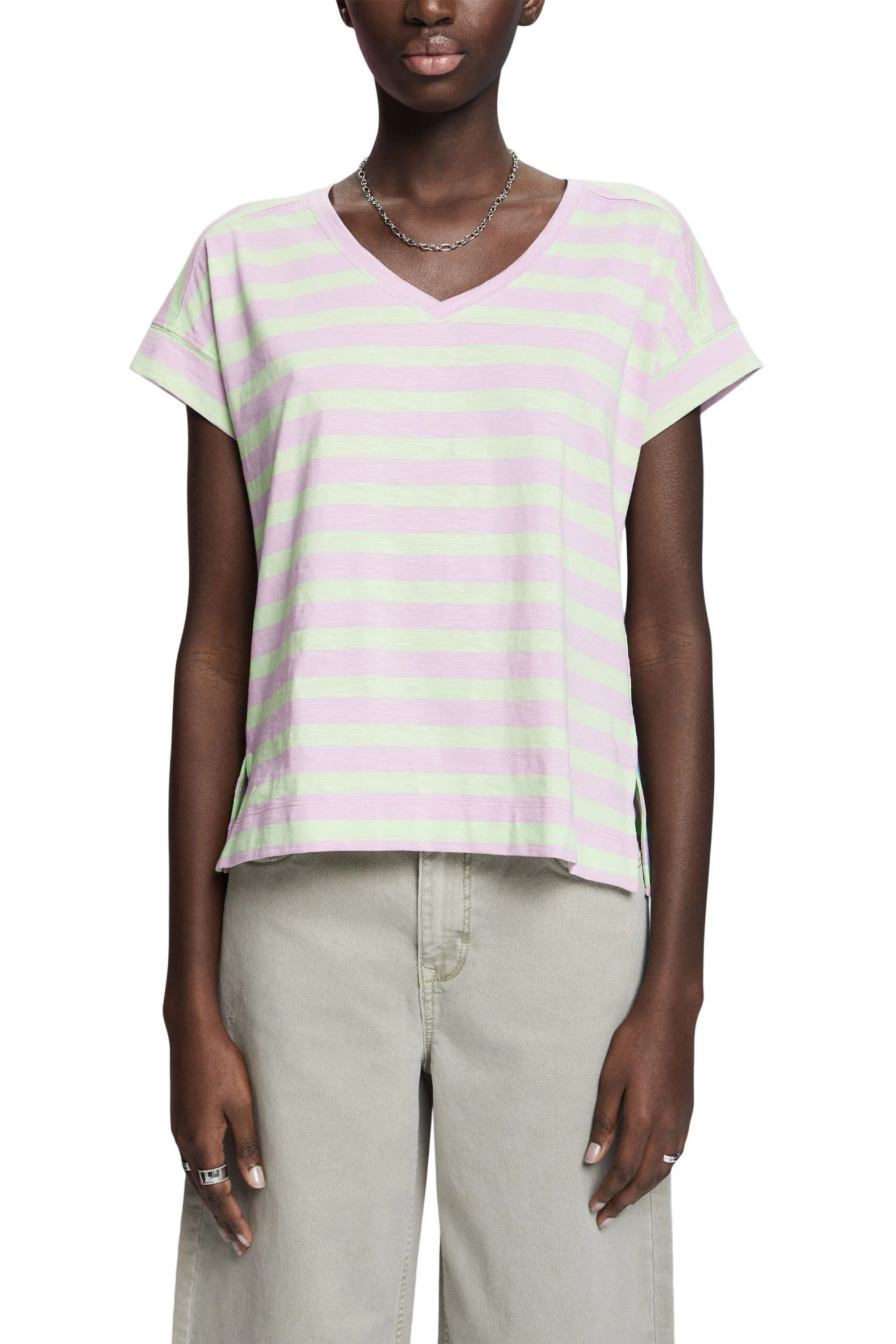 * Jerseyqualität aus reiner Baumwolle * Gerippter V-Ausschnitt * Markantes Muster mit breiten Streifen * Seitliche Schlitze am Saum * Gerade Passform Pflegehinweise: 40°C Pflegeleicht, Nicht bleichen, Nicht im Wäschetrockner trocknen, Mäßig heiß bügeln, Nicht trockenreinigen