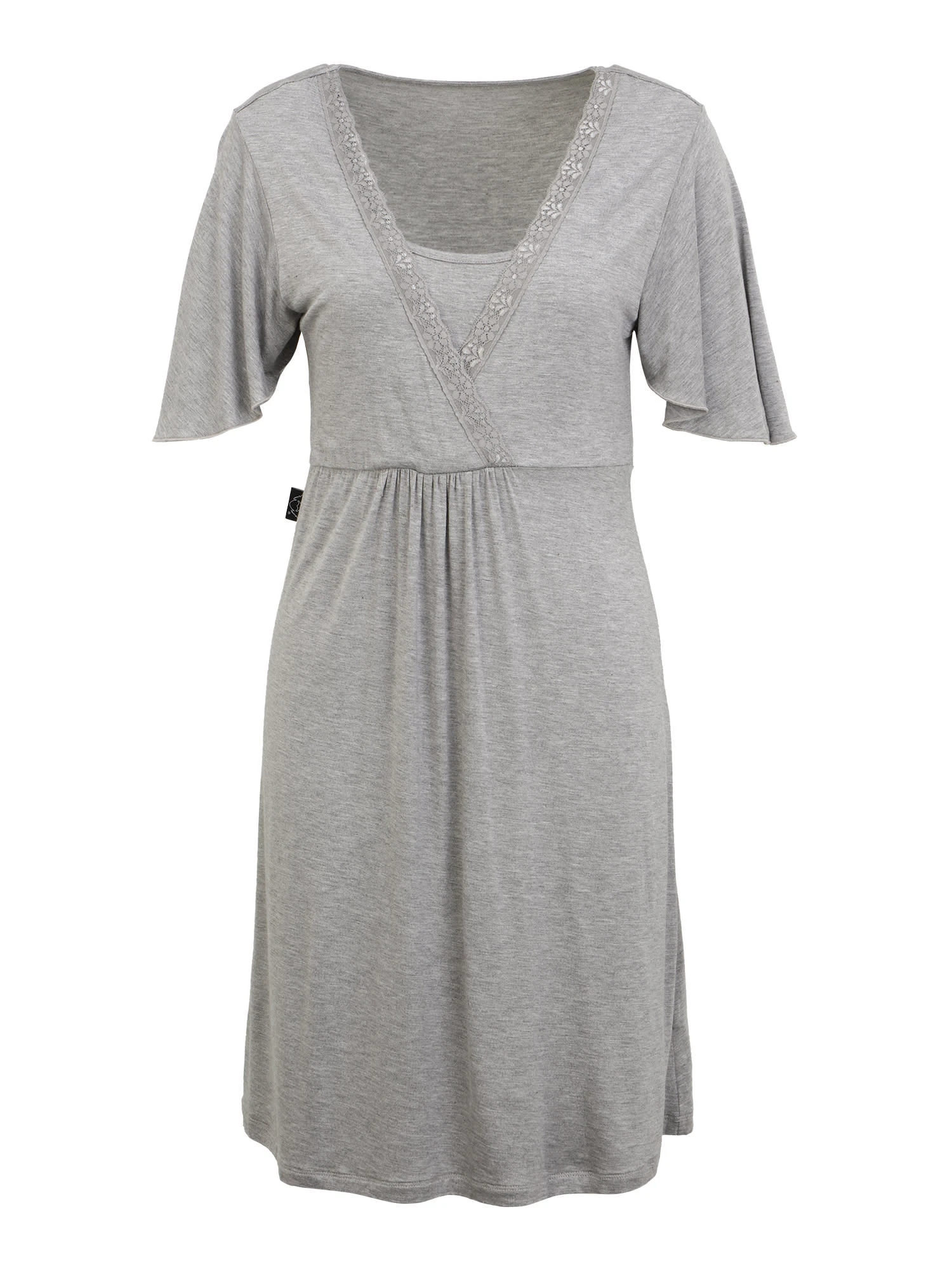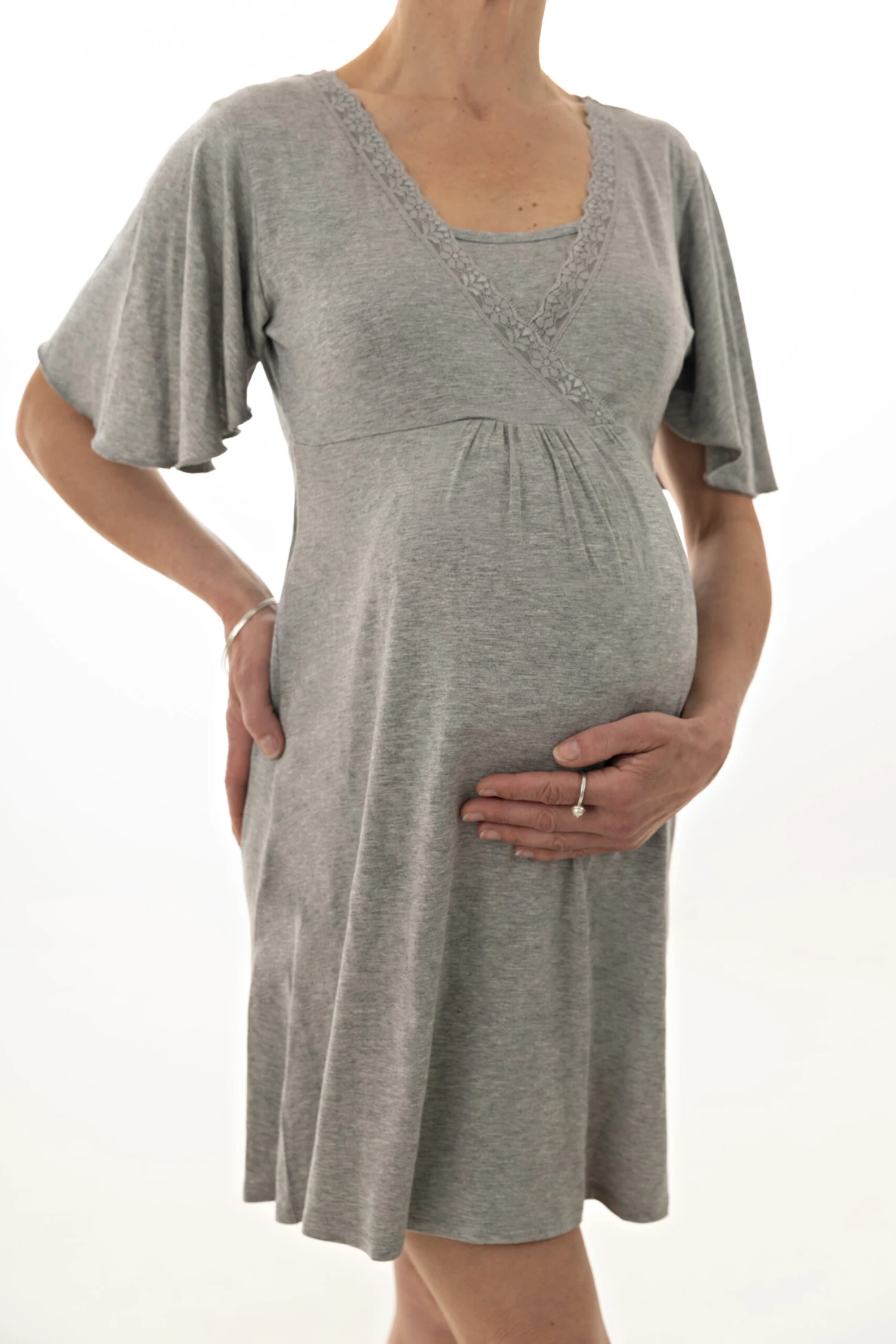 Mit seiner schönen Melangeoptik in edlem Grau, dem angenehm weichen und gefälligen Material aus Baumwollviskose und dem unkomplizierten Look mit schönem Spitzenband bist Du mit dem Umstandskleid während Schwangerschaft, Geburt und Stillzeit optimal ausgerüstet und angezogen.