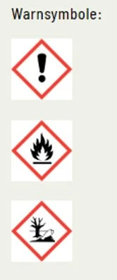 Warnhinweise: GEFAHR Vorsicht! Unbedingt beachten! Gesundheitsschäden durch Einatmen möglich! Nur im Freien oder bei guter Belüftung verwenden! Nur wenige Sekunden sprühen! Großflächige Leder- und Textilerzeugnisse nur im Freien besprühen und gut ablüften lassen! Von Kindern fernhalten! Extrem entzündbares Aerosol. Behälter steht unter Druck: Kann bei Erwärmung bersten. Verursacht Hautreizungen. Kann Schläfrigkeit und Benommenheit verursachen. Giftig für Wasserorganismen, mit langfristiger Wirkung. Von Hitze, heißen Oberflächen, Funken, offenen Flammen und anderen Zündquellen fernhalten. Nicht rauchen. Nicht gegen offene Flamme oder andere Zündquelle sprühen. Nicht durchstechen oder verbrennen, auch nicht nach Gebrauch. Vor Sonnenbestrahlung schützen. Nicht Temperaturen über 50°C aussetzen. Einatmen von Dampf/Aerosol vermeiden. Nur im Freien oder in gut belüfteten Räumen verwenden. Bei Unwohlsein GIFTINFORMATIONSZENTRUM/Arzt anrufen. Bei Hautreizung: Ärztlichen Rat einholen/ärztliche Hilfe hinzuziehen. Ist ärztlicher Rat erforderlich, Verpackung oder Kennzeichnungsetikett bereithalten. Entsorgung des Inhalts/Behälters gemäß den örtlichen Vorschriften. Darf nicht in die Hände von Kindern gelangen. Enthält: Kohlenwasserstoffe, C6-7, n-Alkane, Isoalkane, cyclische, < 5% n-Hexan.