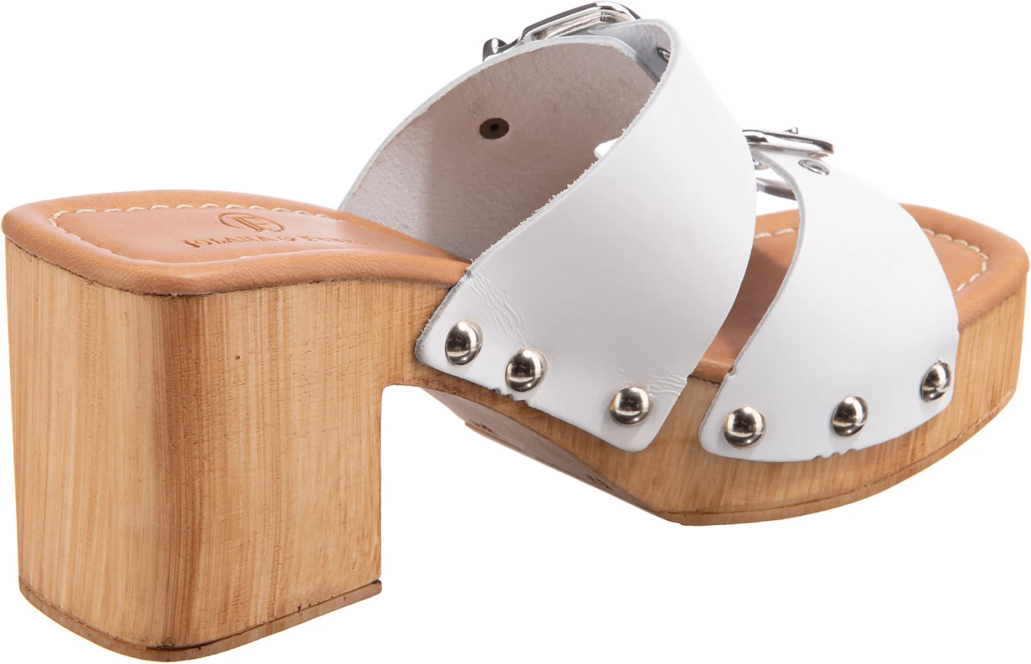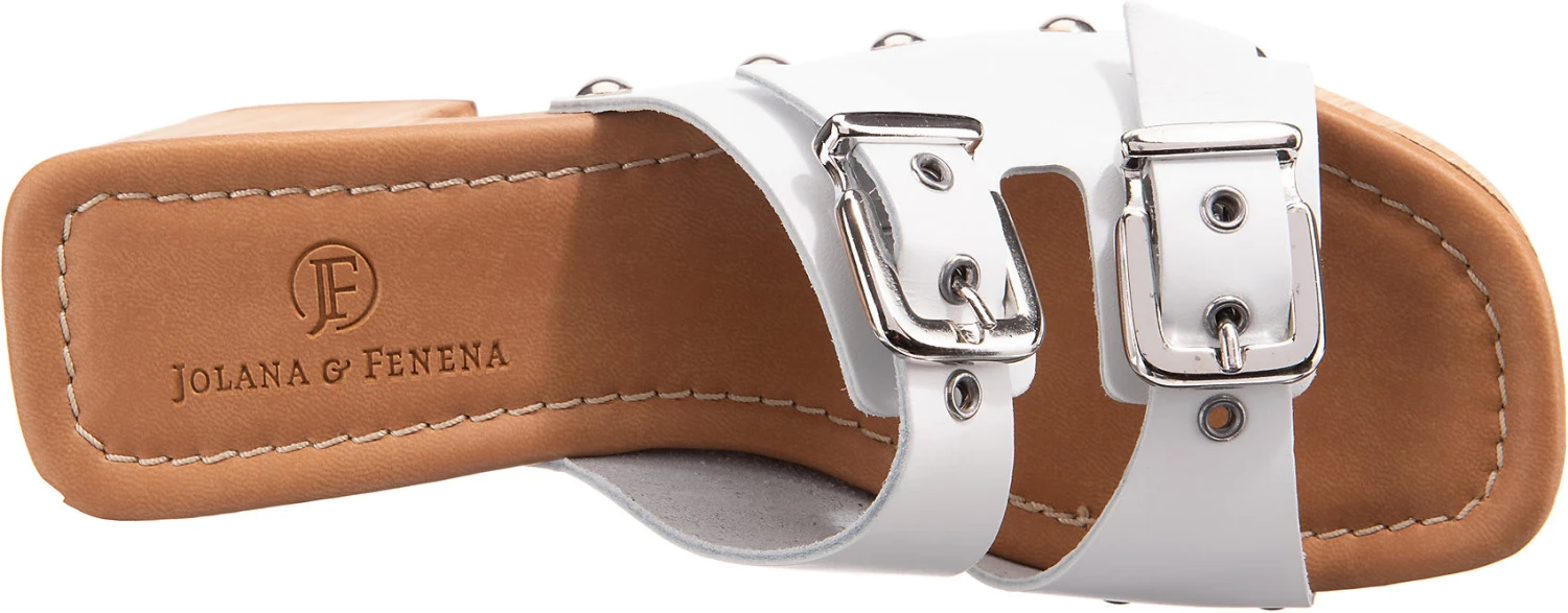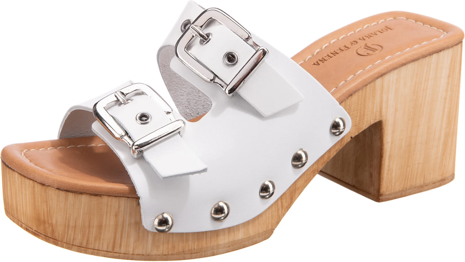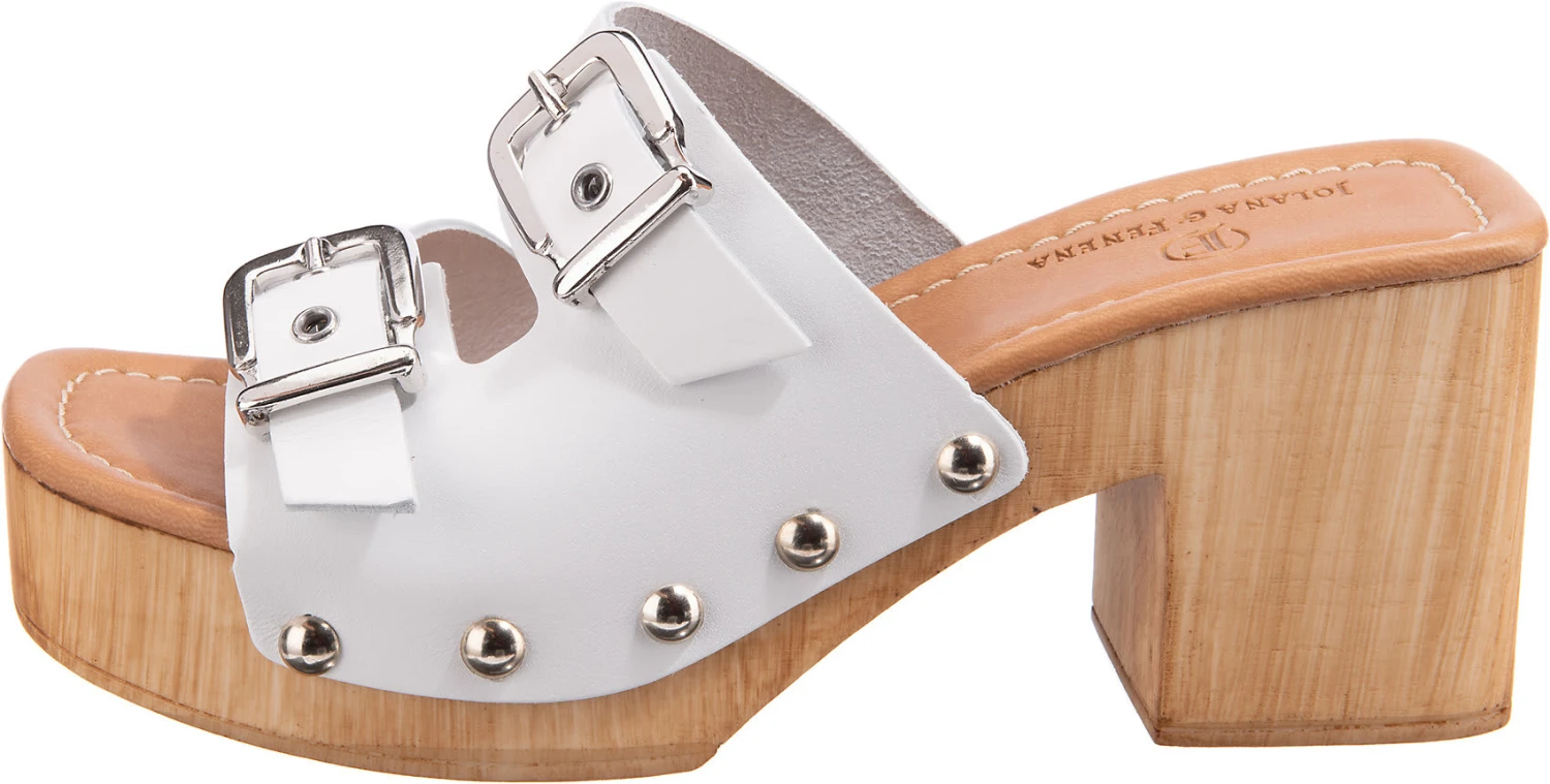 Aus dem Hause JOLANA & FENENA: Die praktischen Clogs. Das Schuhpaar ist aus echtem Leder. Der extravagante Absatz präsentiert sich mit beachtlicher Höhe.
