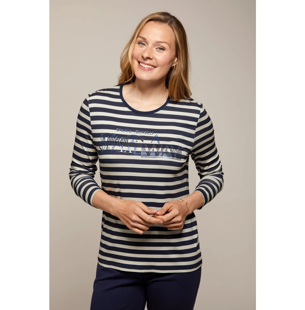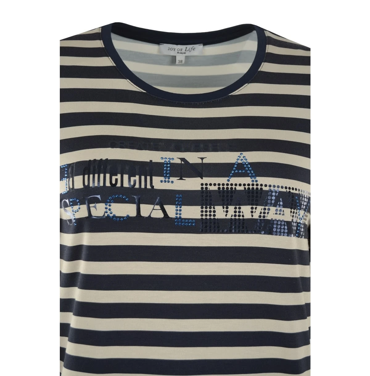 Das Besondere an diesem Shirt ist der platzierte Folienprint mit dezenten Strasselementen. Das zweifarbige Ringelmuster verbreitet sofort gute Laune. Die angenehmen Trageeigenschaften sind weitere Argumente, die für das Shirt von JOY OF Life sprechen. Modell: HAJ-19201