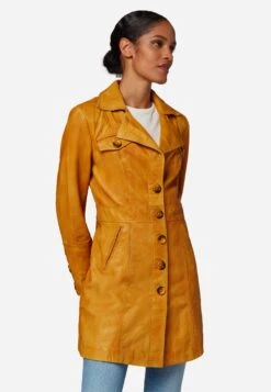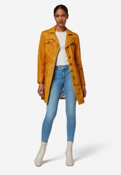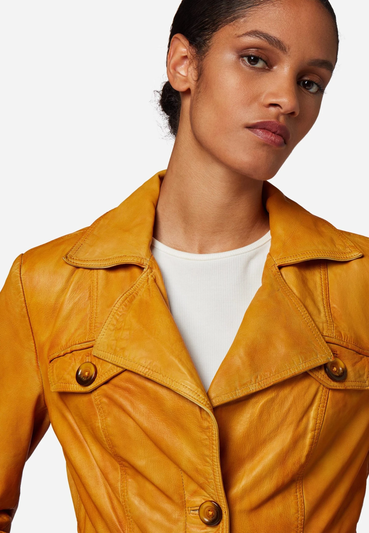 Lederjacke Lucy in Gelb für Damen von Ricano® aus Lamm-Nappa Leder – Kurzmantel – Femininer und figurbetonter Slim Fit – Innenfutter: 100% atmungsaktives Polysatin – Ideal für den Übergang im Frühling und Herbst – Übergangsmantel – Größenausfall: Ledermantel fällt größengerecht aus. Enthält nichttextile Bestandteile tierischen Ursprungs.