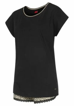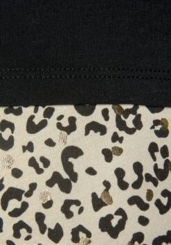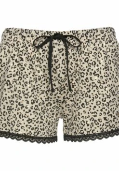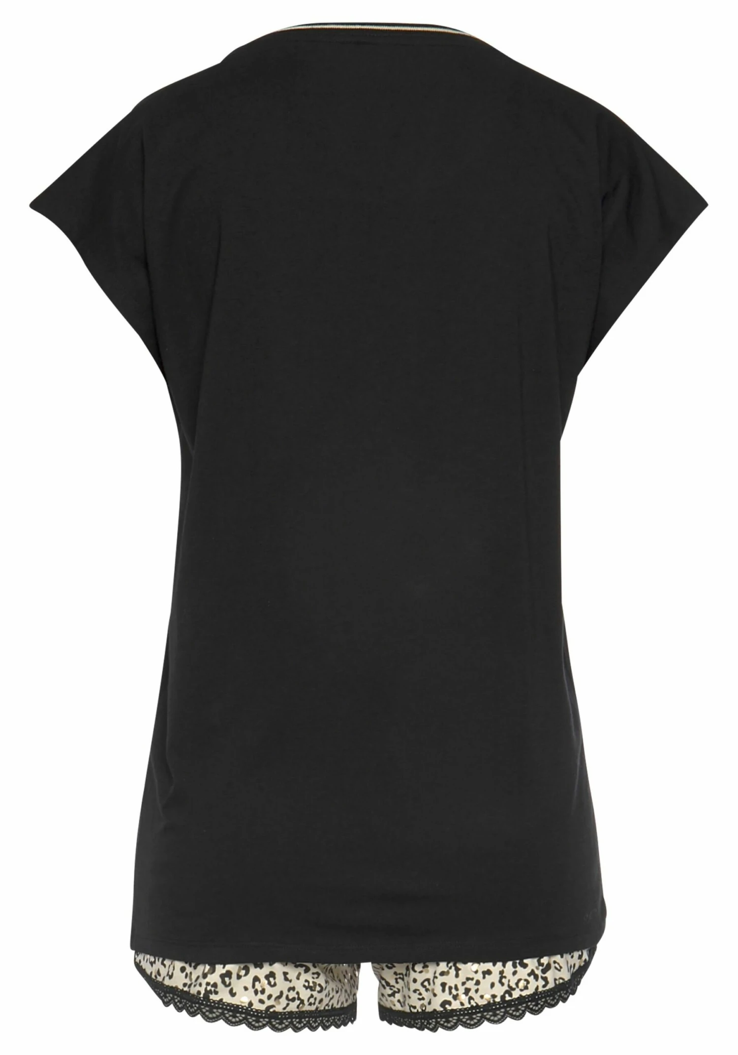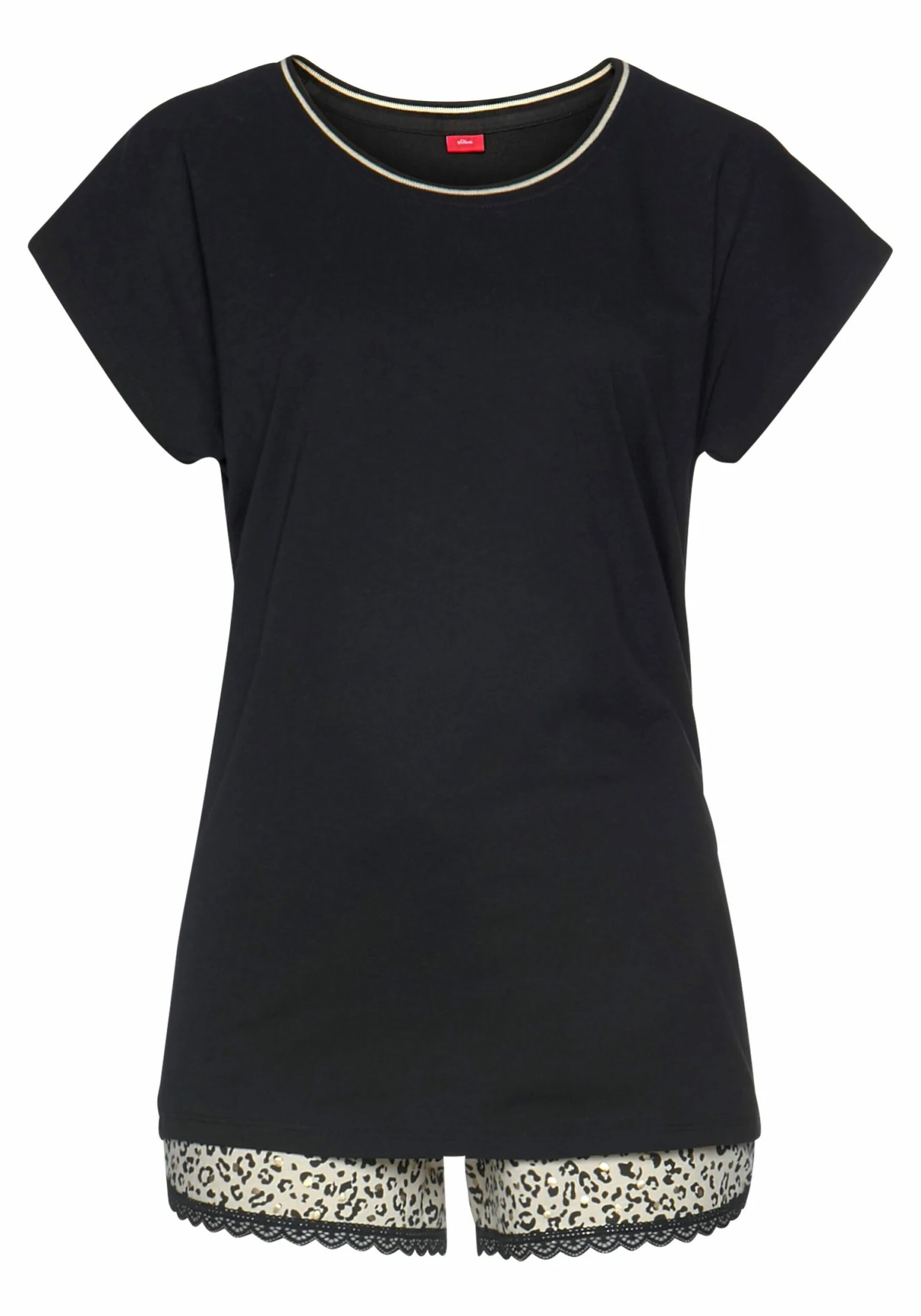 s.Oliver Shorty mit Leoprint. Shirt mit kurzen, angeschnittenen Ärmeln und Rundhalsausschnitt. Allover bedruckte Shorts mit elastischem Tunnelzugbund und Spitzeneinsatz an Säumen. Obermaterial: 50% Baumwolle (unterstützt Cotton made in Africa) , 50% Viskose