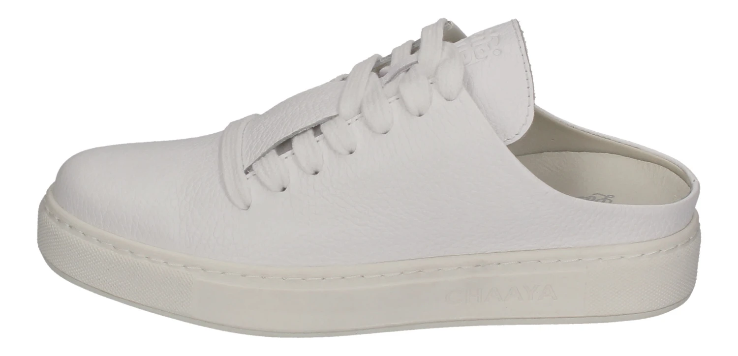 Sind es Sneakers oder Pantoletten? Wir können uns nicht entscheiden. Es sind auf jeden Fall aus beiden Schuhtypen die besten Eigenschaften stylisch vereint worden. Der stylische Damenschuh Shakti Floater Sabo, hier in weiß, von Chaaya sticht aus der Masse der Sneakers hervor durch die markante Form der, über dem Fußrücken liegenden, Zunge und eben die hinten offene Ferse. Diese coolen Damenschuhe sind sehr stylisch aber dennoch zeitlos und absolut gemütlich – sie werden Sie nie mehr ausziehen wollen.