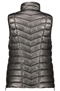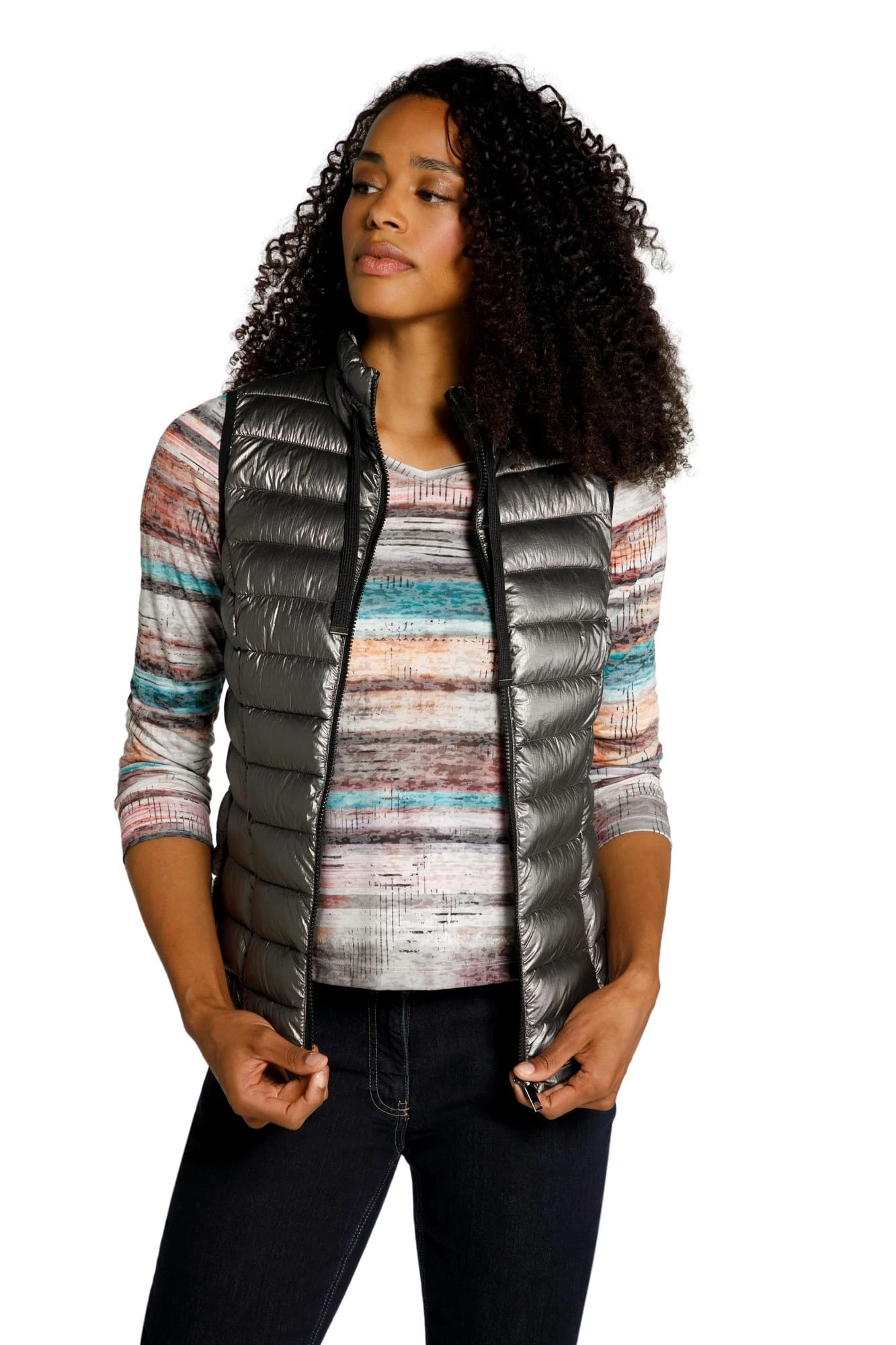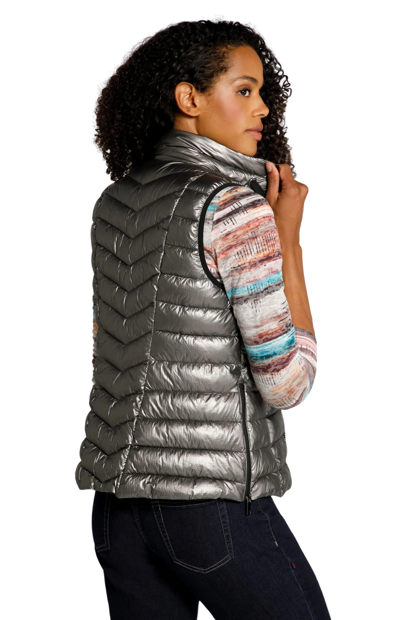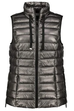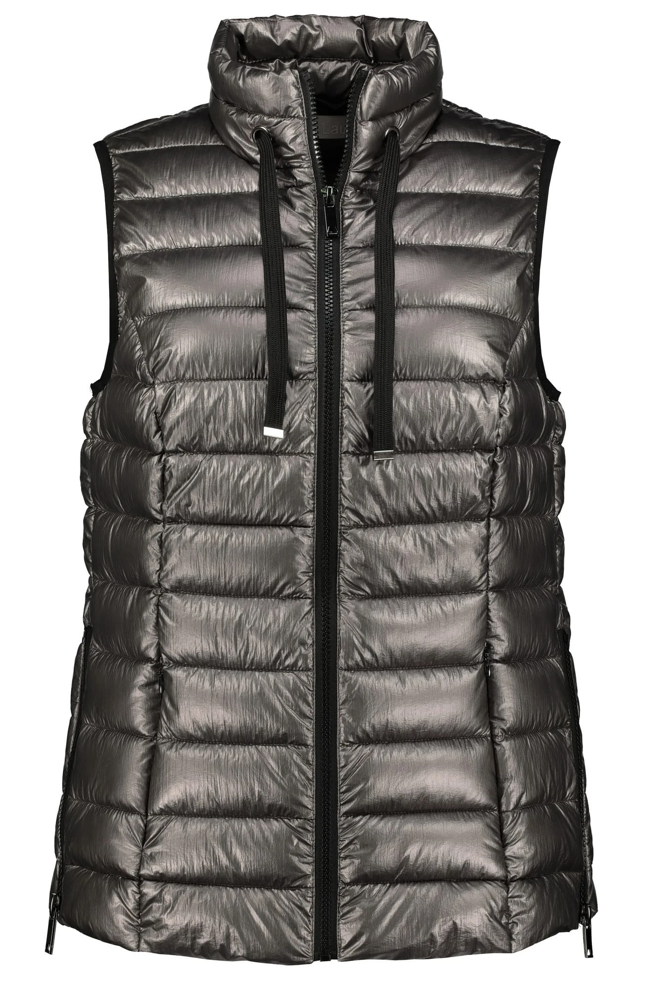 Steppweste, mit Zipper seitlich am Saum. Bindeband im Stehkragen, Zipper, 2 Zipptaschen. Elastische Armausschnitte. Das Model ist 179cm groß und trägt Größe M.