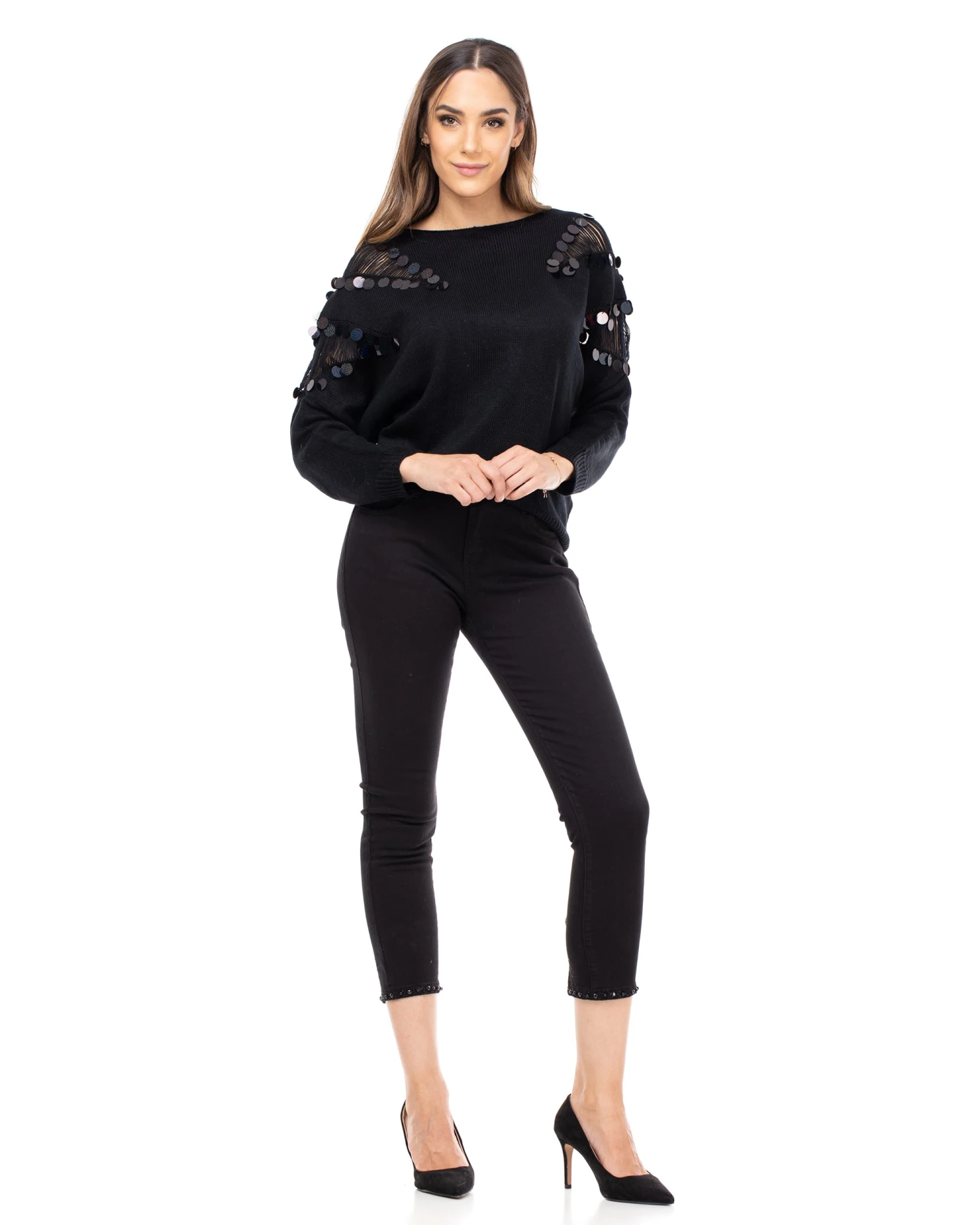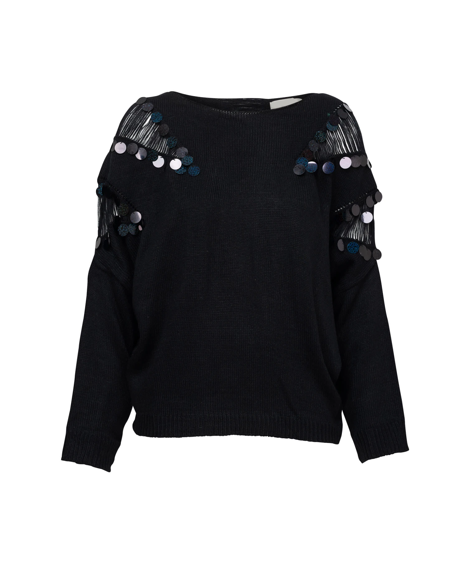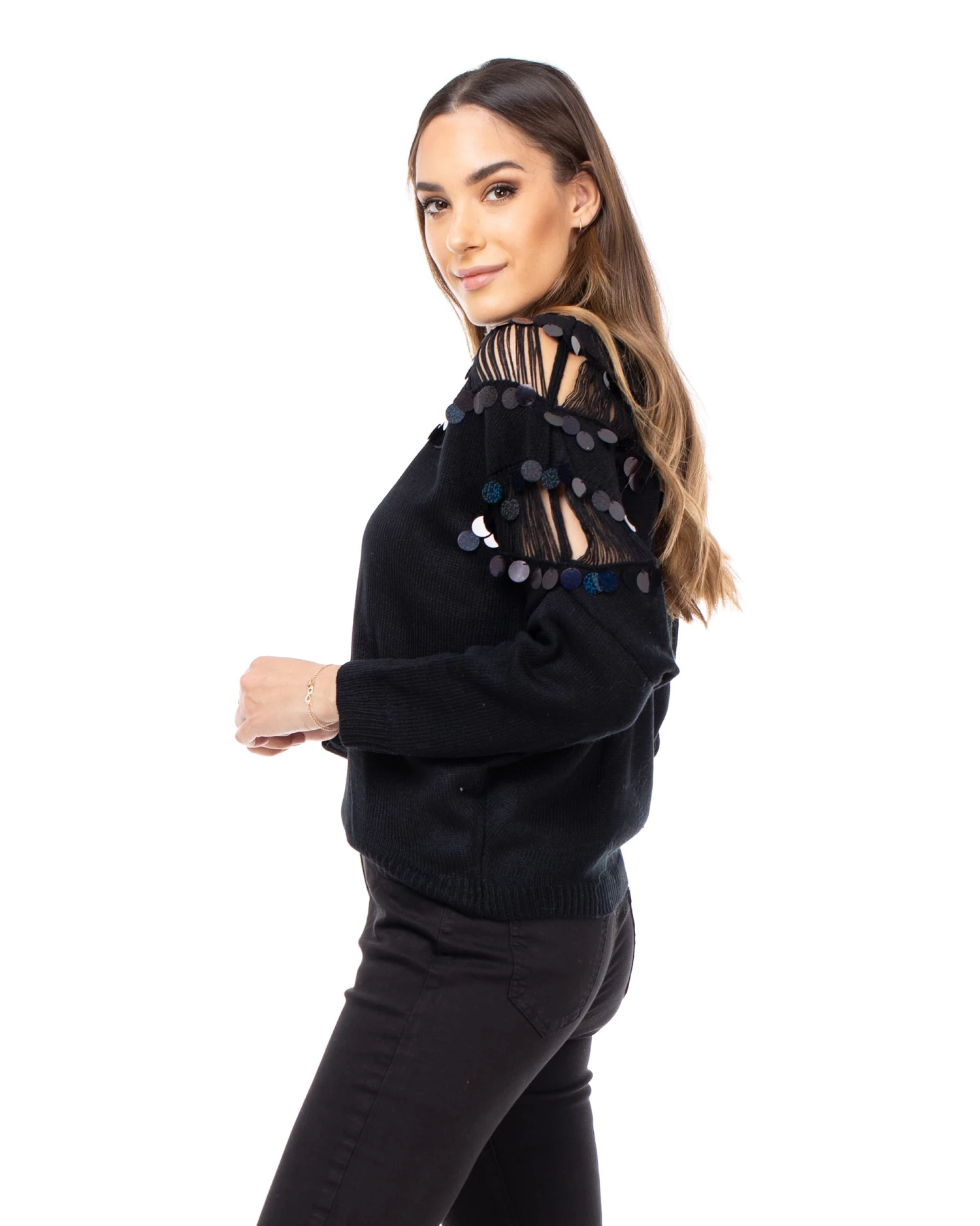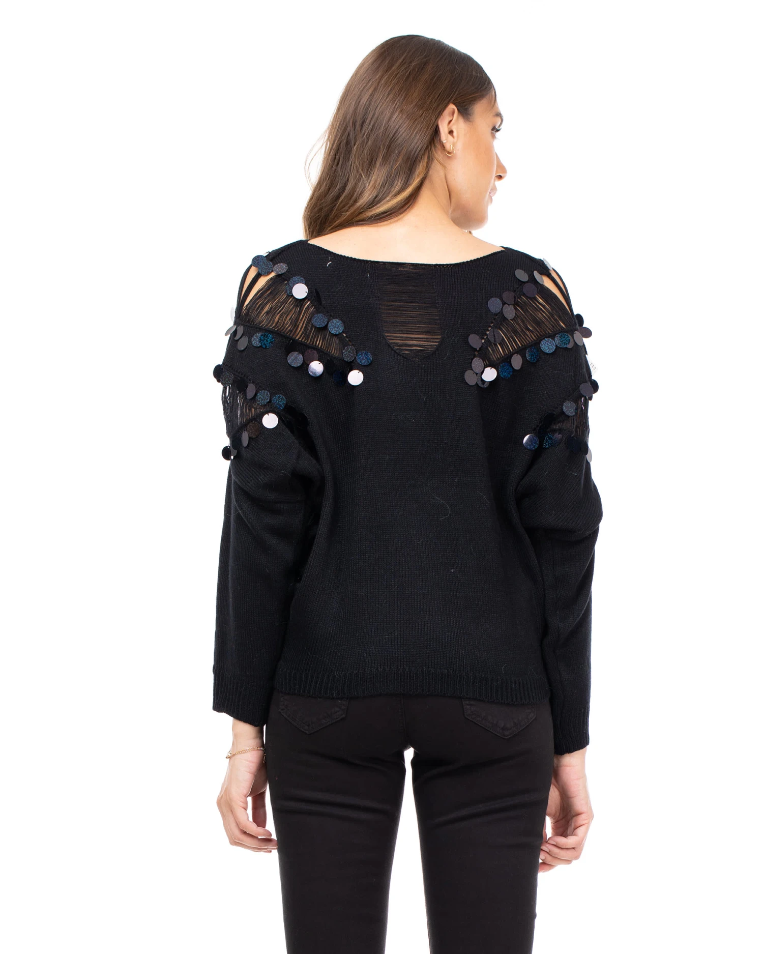Strickpulli mit Pailletten und Transparenzen an den Schultern und am Rundhalsausschnitt.
