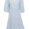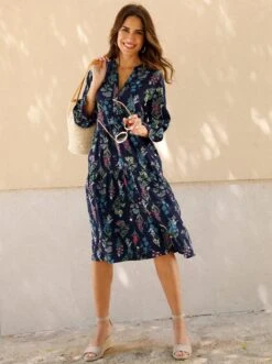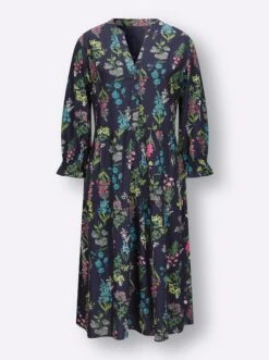 Weich fließendes, schmeichelndes Stufenkleid in floralem Dessin. Leicht ausgestellte Form. Rundhals-Ausschnitt mit offenem V und kurzer Knopfleiste. Formgebende Brustabnäher. 3/4-Ärmel mit elastischen Bündchen und Volants.