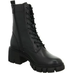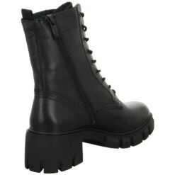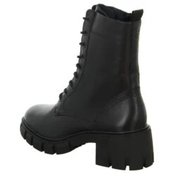 Tamaris Damen Stiefeletten/ Combat Boots/ Schnürstiefeletten Schwarz Leder-Synthetik-Mix – Schnürung und Reißverschluss – Ziernähte – gepolsterte Decksohle – leichtes Futter für kühle Tage – verstärkter Fersenbereich – Anziehlasche – rutschhemmende Profillaufsohle – ca. 6 cm Blockabsatz – zum Teil aus recycelten Materialien
