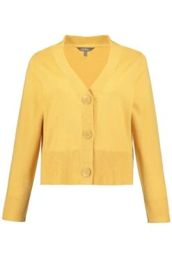 Strickjacke, Slim Fit. Kurze Form aus weichem Feinstrick mit V-Ausschnitt und Knöpfen in Holzoptik. Langarm, Rippbündchen.