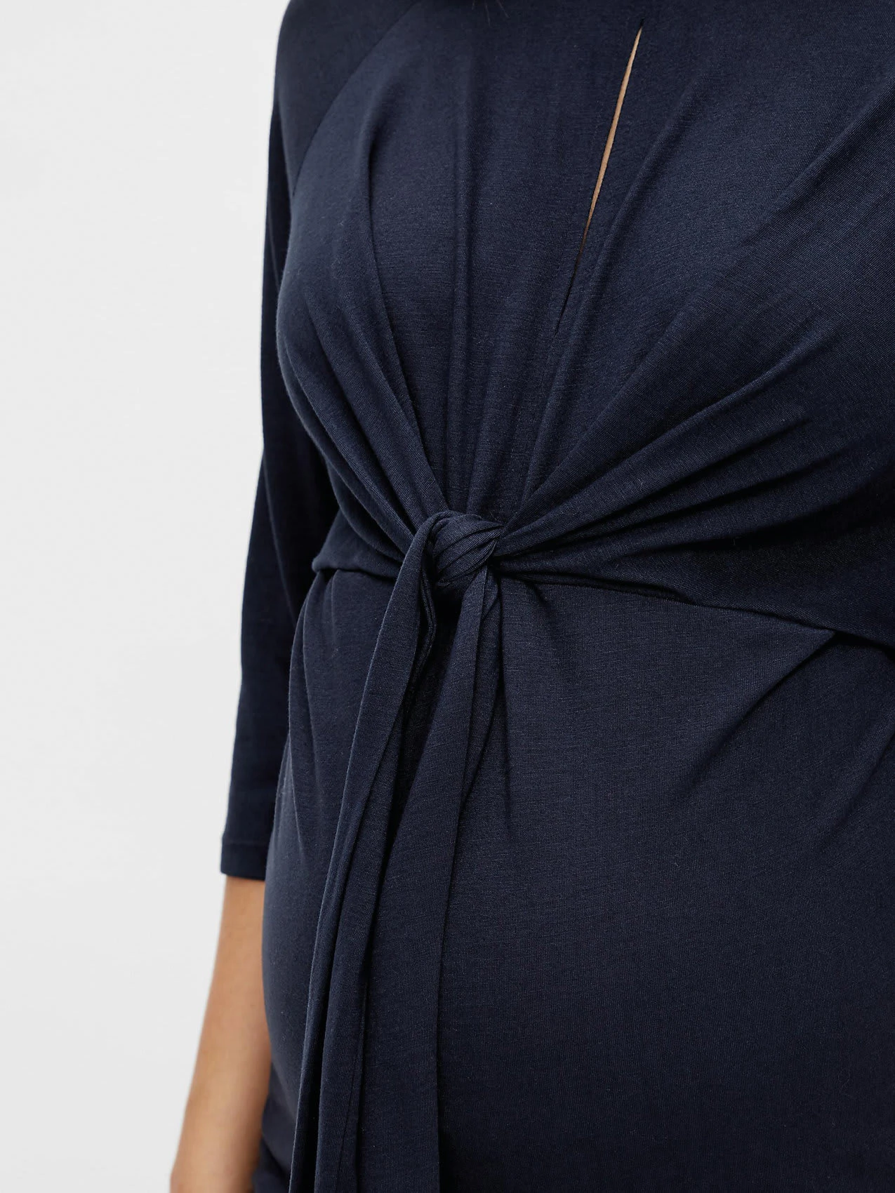 Das Umstands-Kleid Zilke von Mamalicious überzeugt mit einem gleichermaßen puristischen wie raffinierten Design und angenehmen Trageeigenschaften. Umstands-Kleid von Mamalicious unifarben Ärmel in 3/4-Länge Wickel-Optik und Knoten-Detail Rundhalsausschnitt Jersey elastischer Baumwoll-Mix Aus softem Baumwoll-Jersey gearbeitet, passt sich das Kleid den sich während der Schwangerschaft verändernden Körperformen flexibel an. Durch einen kleinen Elasthan-Anteil erhält der Stoff eine noch höhere Dehnbarkeit: ideal, um mit dem Babybauch mitzuwachsen. Das in Wickel-Optik designte Oberteil verfügt über modische 3/4-Ärmel und einen runden Ausschnitt. Akzentuiert wird es von einem Bindeband mit verspielten Knoten, der die angedeutete Empire-Linie unterstreicht.