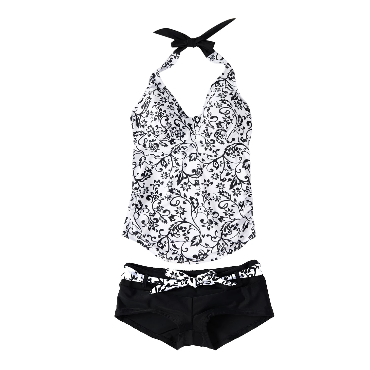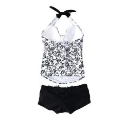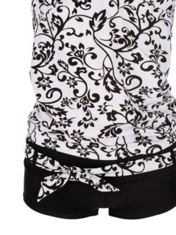 Raffinierte Umstandsbademode „Black&White D-E Cup“ ist nicht nur für Schwangere ein „Must-Have Design Klassiker“: Als Neckholder Oberteil zum Binden in attraktivem schwarzen Rankblumenmotiv auf weißem Grund und abgesetzt mit schwarzen Kontrasten passt dieses Tankiniset auch vor der Schwangerschaft und weit darüber hinaus..