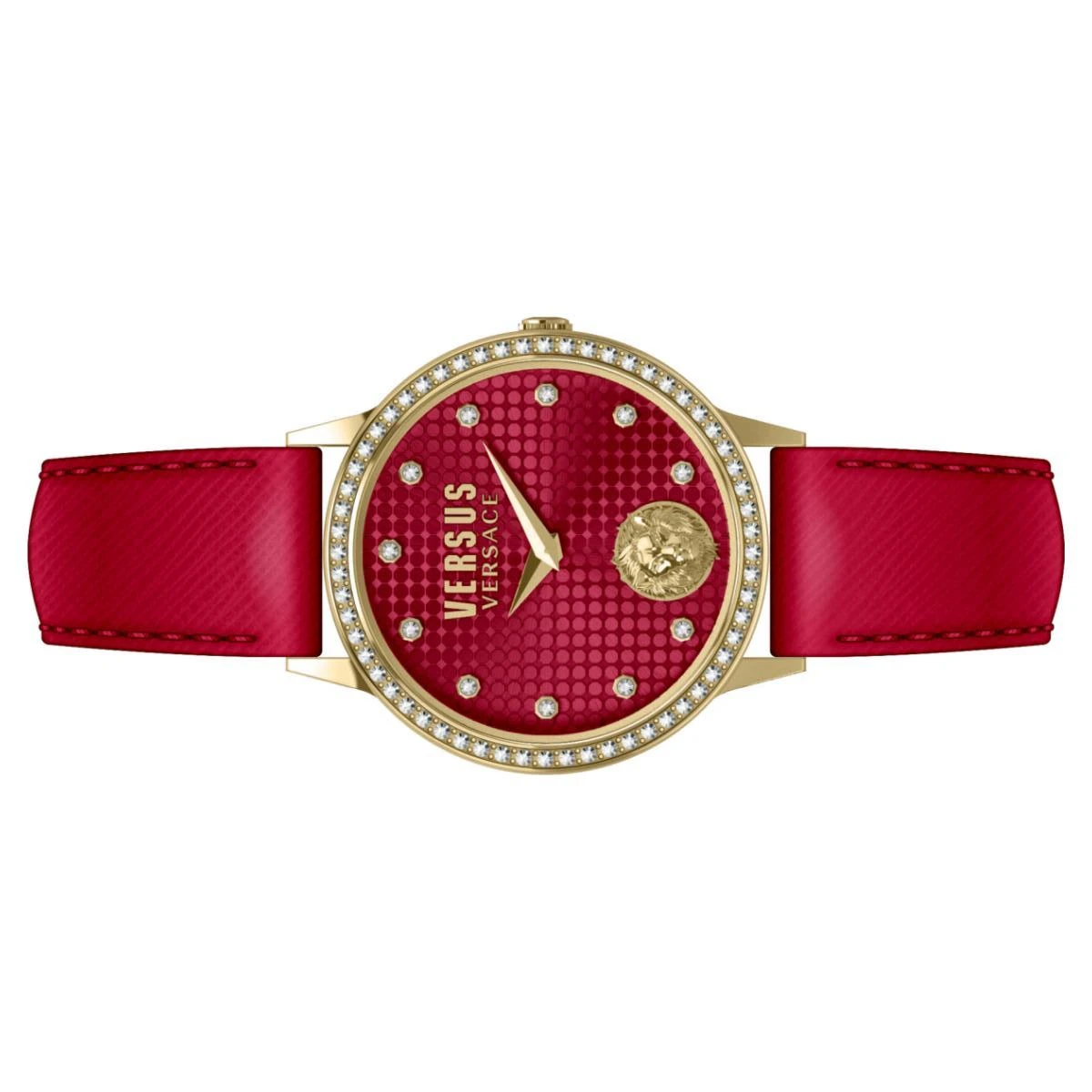 Hersteller: Versus ModellNr : VSP572221 (Strandbank) Zifferblatt: Analoganzeige, Farbe: rot (Guillochiertes) mit goldfarbenen Zeigern Gehäuse: Edelstahlgehäuse goldfarben, Lünette mit Steinchen besetzt, Durchmesser ca. 34 mm, Höhe:ca. 8,2 mm Gehäuseboden: Edelstahl mit Herstellerlogo Armband: hochwertiges Lederarmband rot Breite: ca. 1,1 cm Länge der Uhr: ca. 18 cm Dornschließe Dichtheit: Wasserdicht 3 ATM (30 m) Funktionen / Anzeigen: kratzunempfindliches Mineralglas, Batteriebetriebenes Quarz Uhrwerk Stunden – Minutenanzeige Lieferumfang: Auslieferung in Versus by Versace Geschenkbox